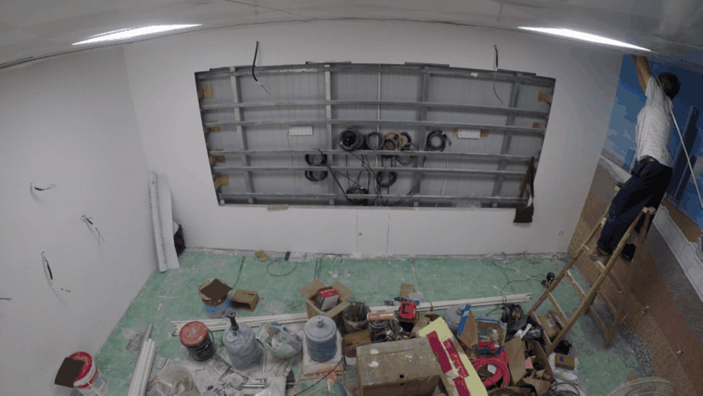 墻面基本工作完成后,開始進行墻面修飾,噴繪高清貼畫,并對LED電路、天花板氛圍燈進行鋪設,以及烤漆構建安裝工作