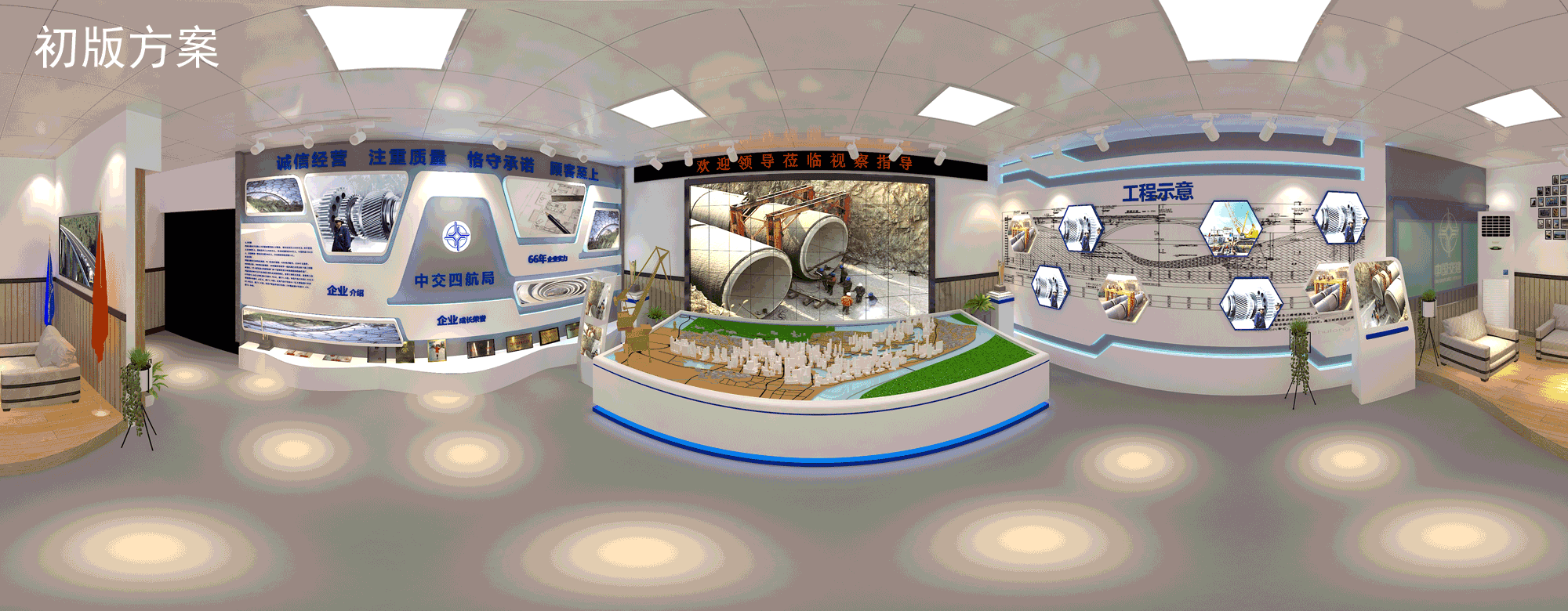 高清LED拼接幕墻,精細(xì)化動(dòng)態(tài)沙盤(pán)模型,高精質(zhì)巨型項(xiàng)目噴繪,VR創(chuàng)新技術(shù)應(yīng)用,整合多種傳播媒介,融合企業(yè)特色文化、企業(yè)榮譽(yù)實(shí)力展示、項(xiàng)目工藝創(chuàng)新等元素,實(shí)力打造多媒體互動(dòng)沉浸式體驗(yàn),360°全方位展示工程實(shí)況。