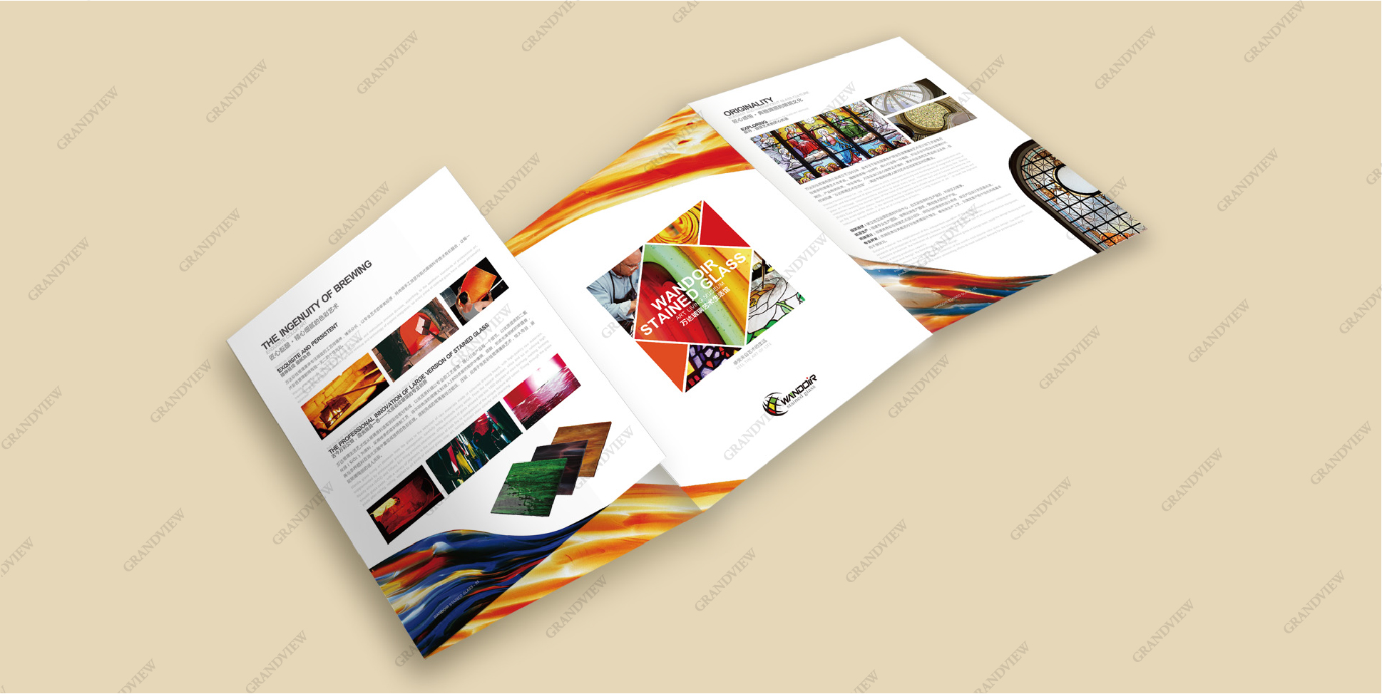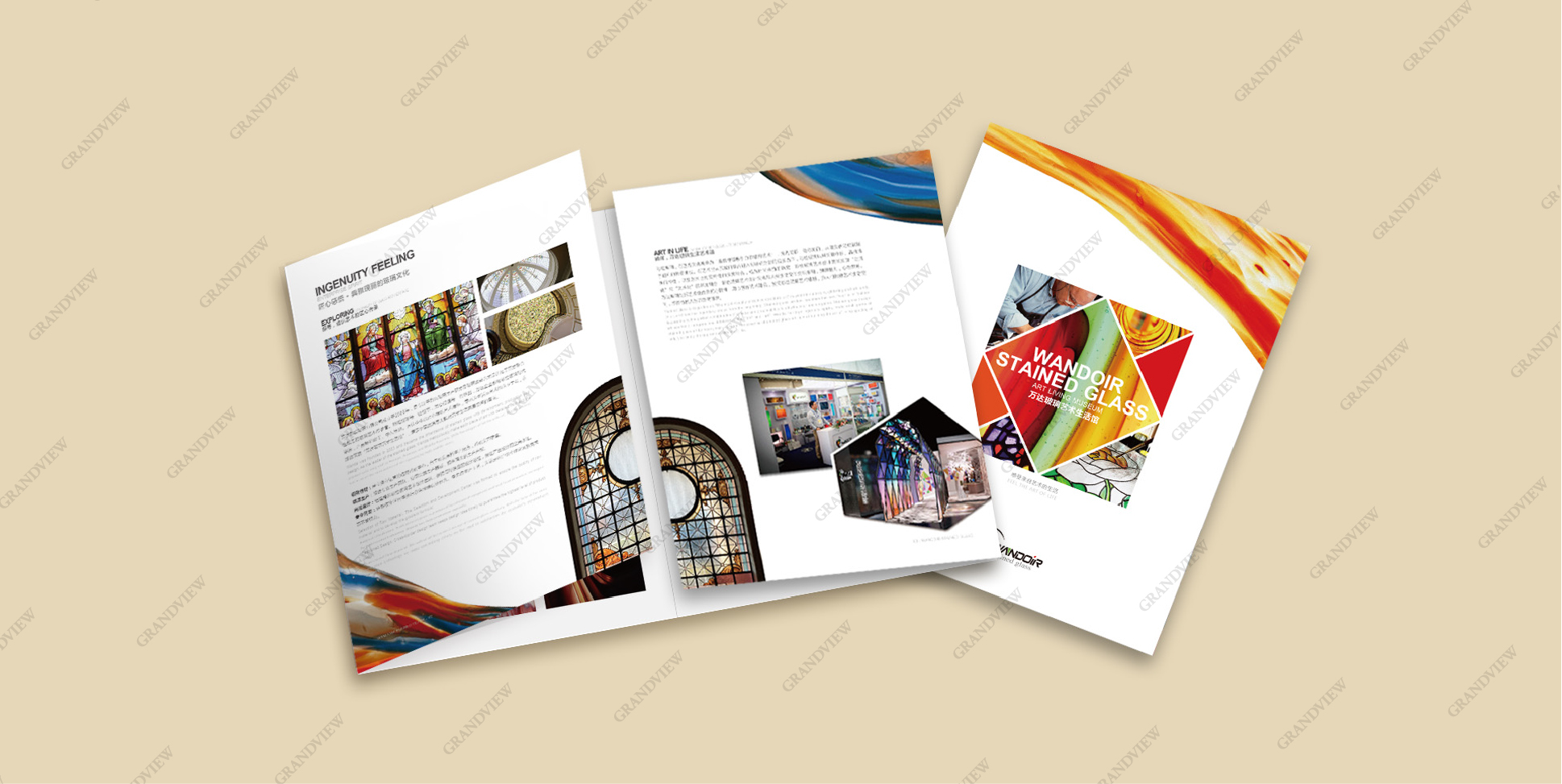 廣角為萬(wàn)達(dá)萬(wàn)達(dá)彩繪玻璃設(shè)計(jì)的折頁(yè)流光溢彩、絢麗燦爛,將“最具視覺(jué)吸引力結(jié)構(gòu)藝術(shù)”的孤傲彩繪玻璃展品融入現(xiàn)實(shí)生活,賦予生活個(gè)性,賦予產(chǎn)品活力。折頁(yè)采用大紅、明黃、深綠等厚重的色彩設(shè)計(jì),集藝術(shù)性和實(shí)用性于一體,充分展示了彩繪玻璃的獨(dú)特風(fēng)格,將彩色玻璃藝術(shù)設(shè)計(jì)文化與人類(lèi)生活空間交織相融,使其更具魅力。